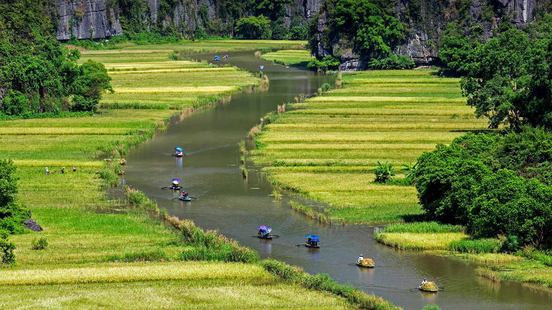Boats float by rice fields on the Ngo Dong River in Ninh Bình province