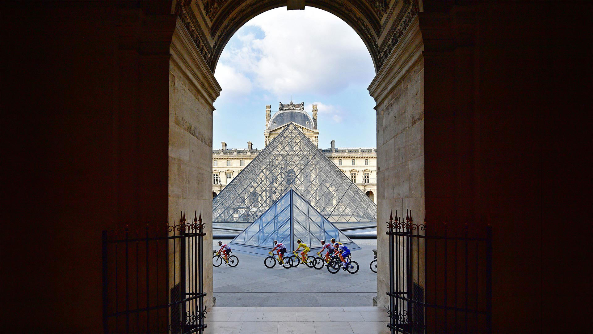 Tour de France riders in front of the Louvre Pyramid and Museum in Paris