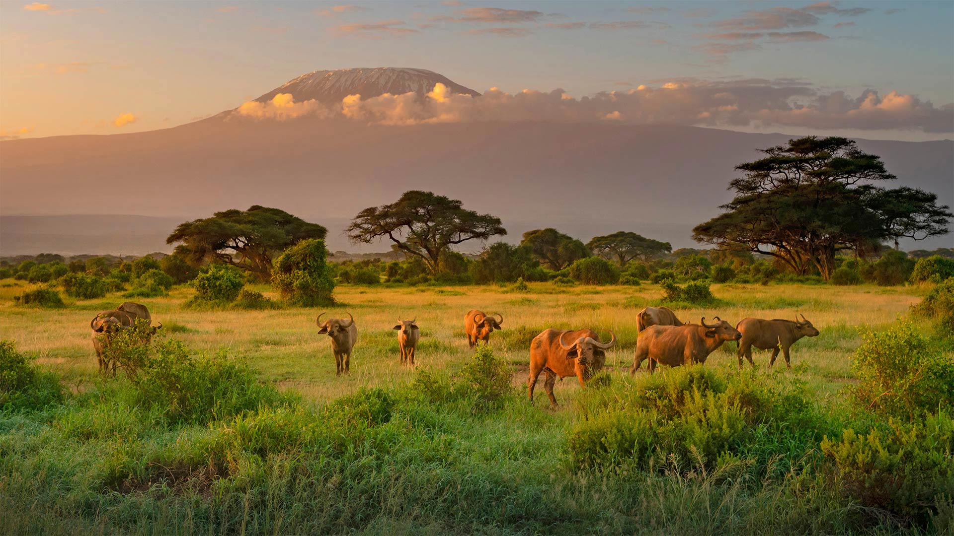 前景中有开普水牛的乞力马扎罗山