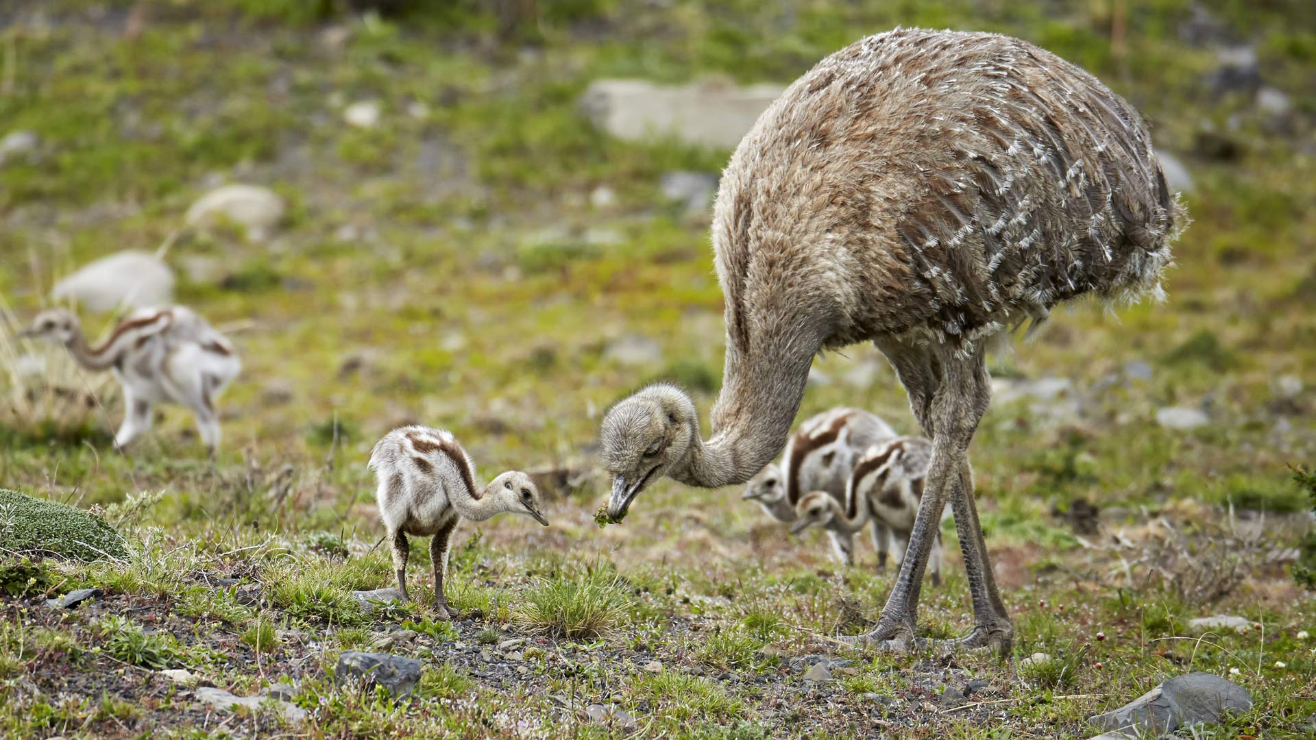 Lesser rhea adult male with chicks, Torres del Paine National Park, Patagonia, 智利 (© Ignacio Yufera/Minden Pictures)